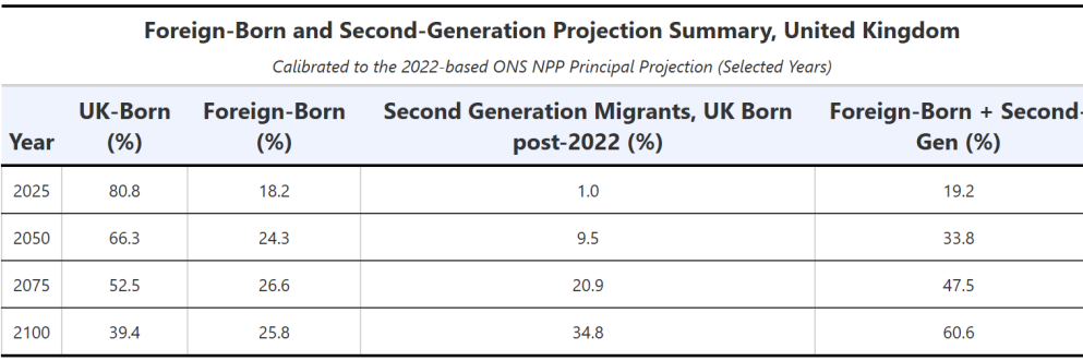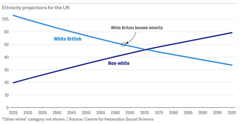 At the same time, the share of people who are UK-born, who can trace their roots on these islands back over a much longer period of time, who have a stronger sense of ancestry, collective memory, and connection to these islands, will collapse from 81 per cent today to just 39 per cent by the year 2100.