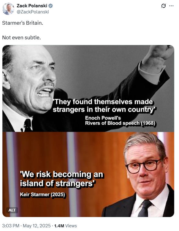 Yes, that’s right. Keir Starmer, the man who has completely lost control of our borders, who is presiding over the wholesale liberalisation of our immigration system, and who instantly took the knee for Black Lives Matter is the new Enoch Powell.