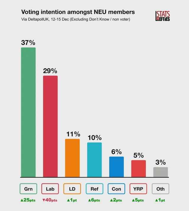 In other words, the most popular party among teachers happens to be the party that is calling for open borders, the legalisation of drugs, wealth taxes, and thinks a “genocide” is taking place in the Middle East — though happens to be much less vocal about what is currently unfolding in Iran.