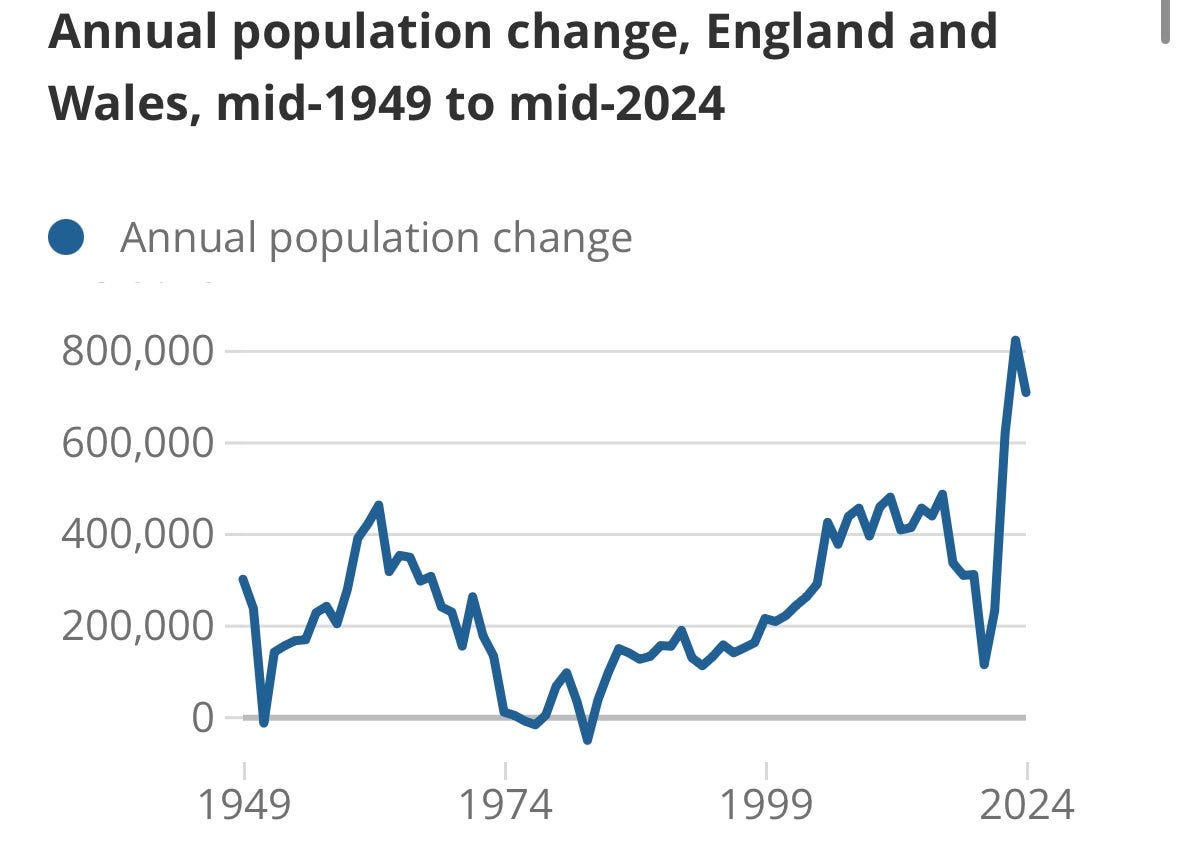 That last year —in one year alone— the population of England and Wales surged by another 707,000 people —an increase of some 1.2 per cent in a single year.