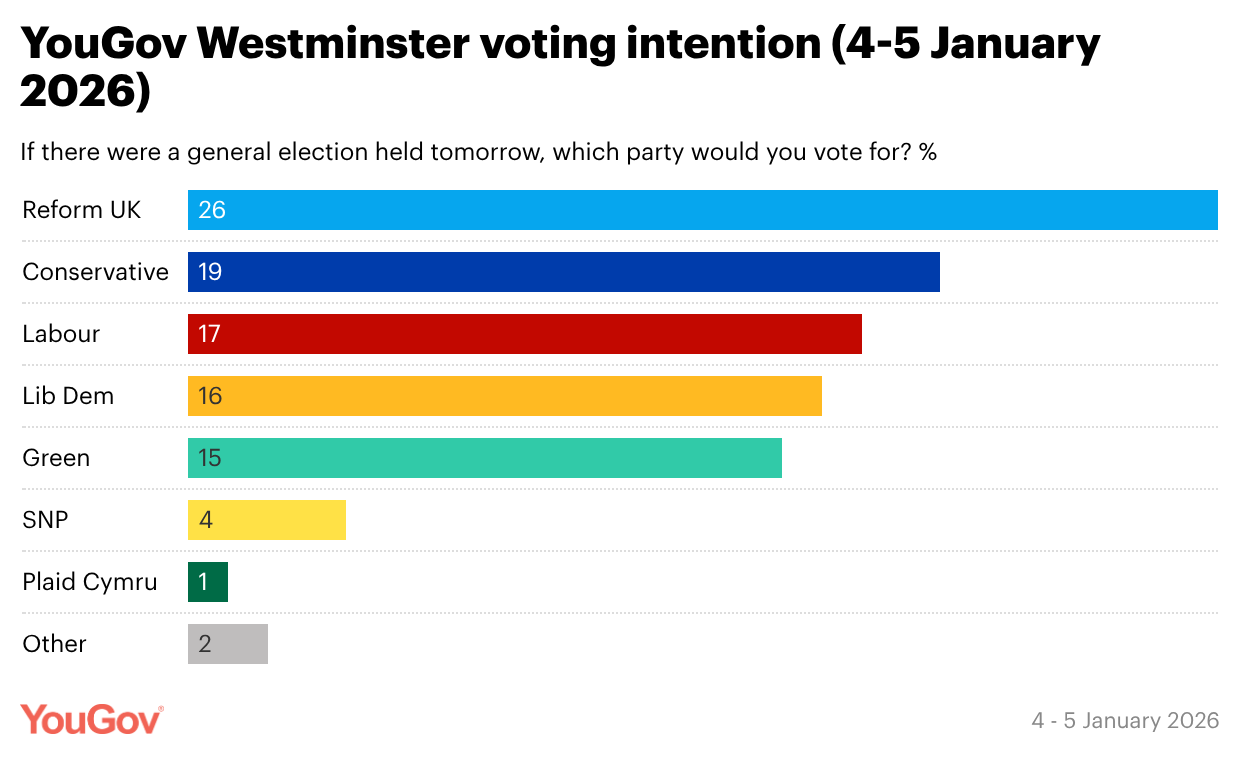 Nigel Farage and Reform continue to lead, on 26%. Kemi Badenoch and the Tories are in a distant second, on just 19%. Keir Starmer and Labour have now slipped into third, on 17%. And Zack Polanski and the Greens are not far behind, on 15%.