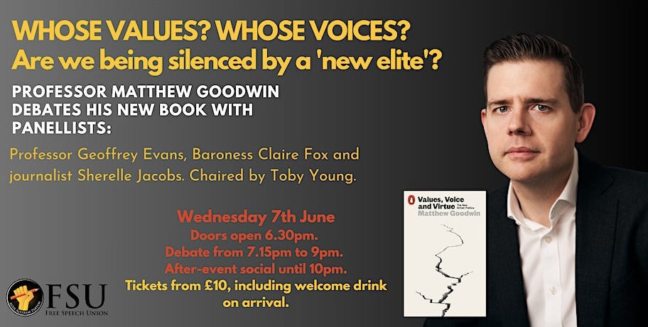 It was great to meet some of you in person at recent events in London. Here’s another unique discount —just for you— to join a debate and social on Wednesday June 7th, in the very heart of Westminster. The panel includes Baroness Claire Fox, journalist Sherelle Jacobs, Professor Geoffrey Evans, and FSU General Secretary Toby Young.