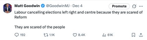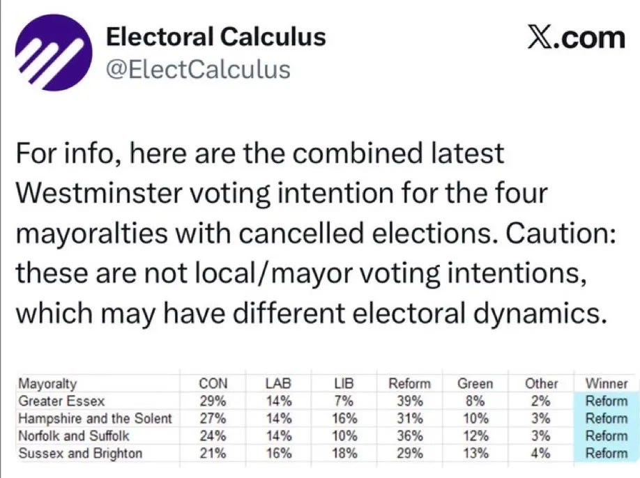 And isn’t it interesting, too, that the elections are being delayed in the very areas where support for the Labour government is crumbling fastest —in areas that are projected to swing behind Reform?