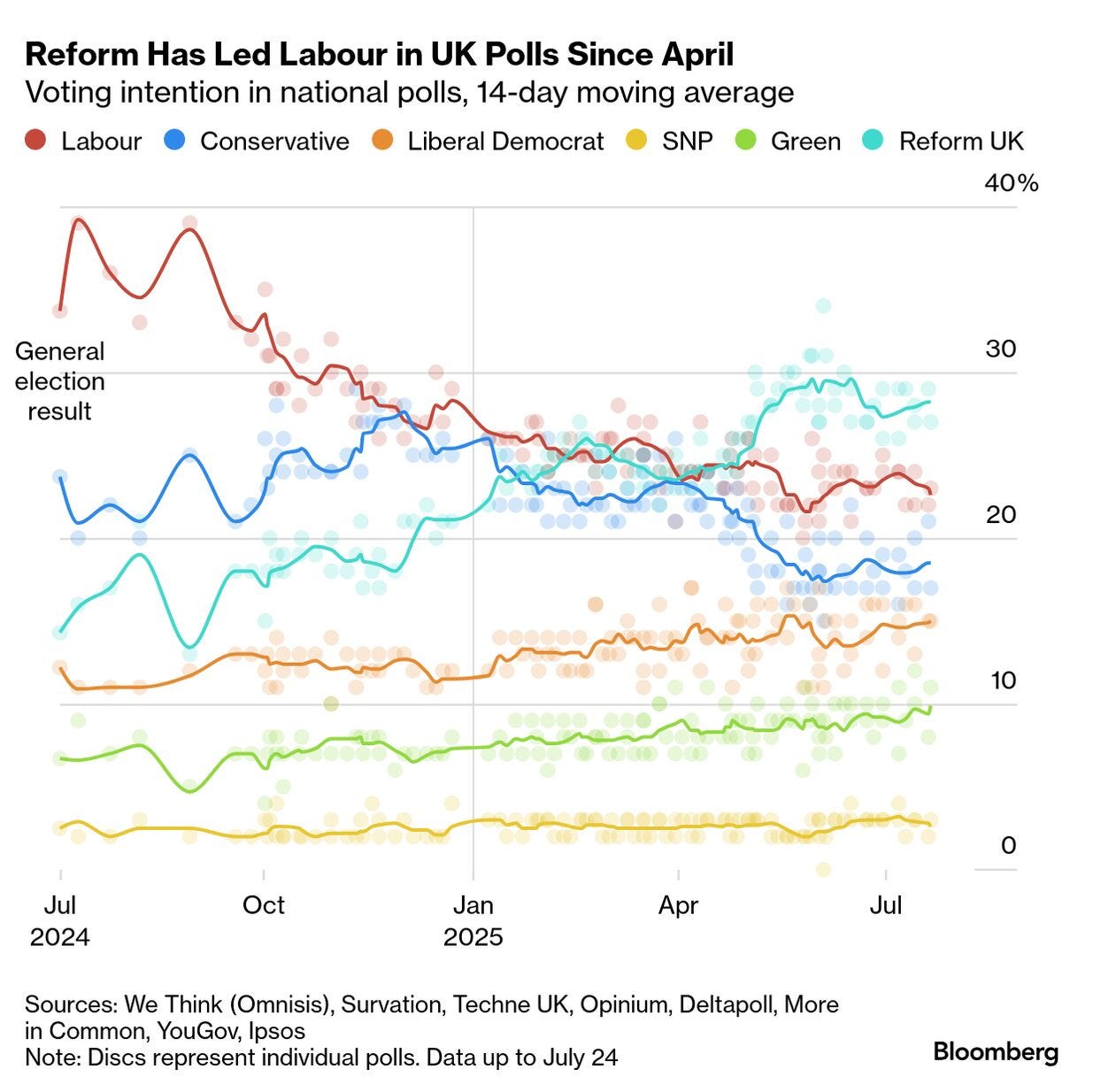 First. The national polls. Since coming to power little more than a year ago, Labour’s support in the polls has collapsed by around 10-points while the party has been replaced at the top of the polls by Nigel Farage and Reform.