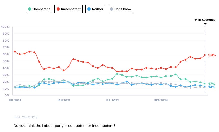 Fifth. Competence. It is often said among pollsters that what determines the future of a party and government is the extent to which voters see them as competent. Well, here too, there is bad news for Labour as the share who view the Labour government as incompetent has been surging upwards, reaching close to 60 per cent of all voters. In fact, not even one in five Brits think the Labour government is competent.