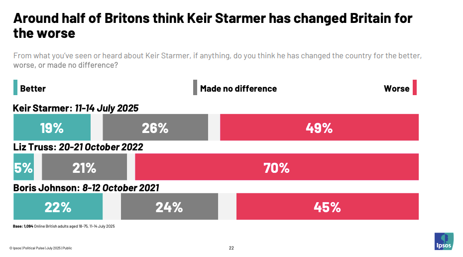 Fourth. And this sense of national decline and deterioration is linked closely in the public mindset with Keir Starmer. Nearly half of all people now believe Keir Starmer “has changed Britain for the worse”, while only 19 per cent think he has “changed Britain for the better”. More people think Starmer has had a negative impact on the country than the share who felt the same about Boris Johnson in late 2021.
