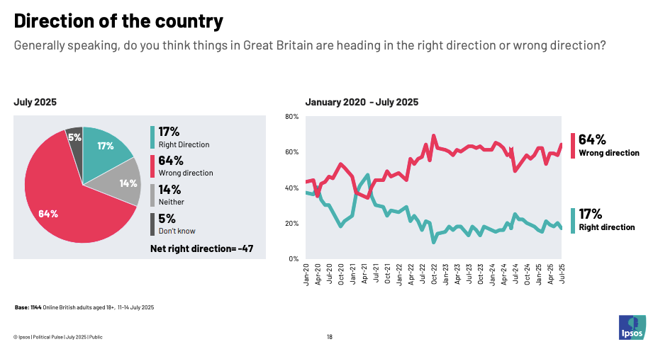 Third. The direction of the country. Long considered one of the most reliable measures of how people are thinking and feeling, when voters are asked whether they think Britain is heading in the right or wrong direction, an overwhelming majority, roughly two-thirds, now say ‘things are heading in the wrong direction’. Not even one in five people, just 17 per cent, think things in Britain are heading in the right direction —a damning assessment of the Labour government.