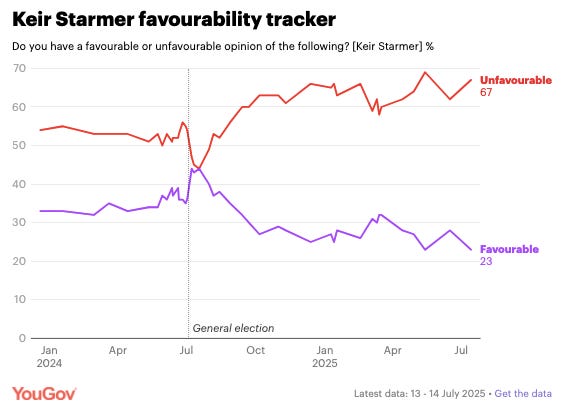 This summer, Starmer’s net rating has crashed to MINUS 44, with more than two-thirds of the entire country now thinking unfavourably of him.