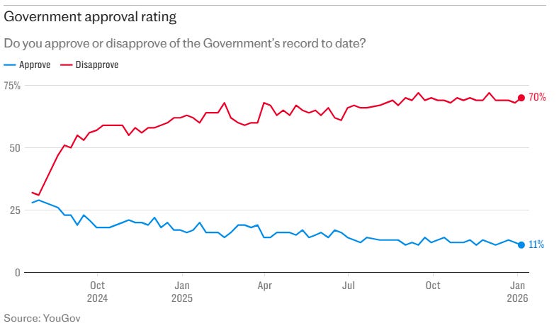 Keir Starmer’s Labour government has started 2026 in a truly awful state. In the polls, it has just slumped to a truly abysmal approval rate of 11% —a record low. It has fallen to third place, behind Reform and even the Tories. And only 6% of British people think it ‘very likely’ Keir Starmer will still be prime minister at the end of the year.