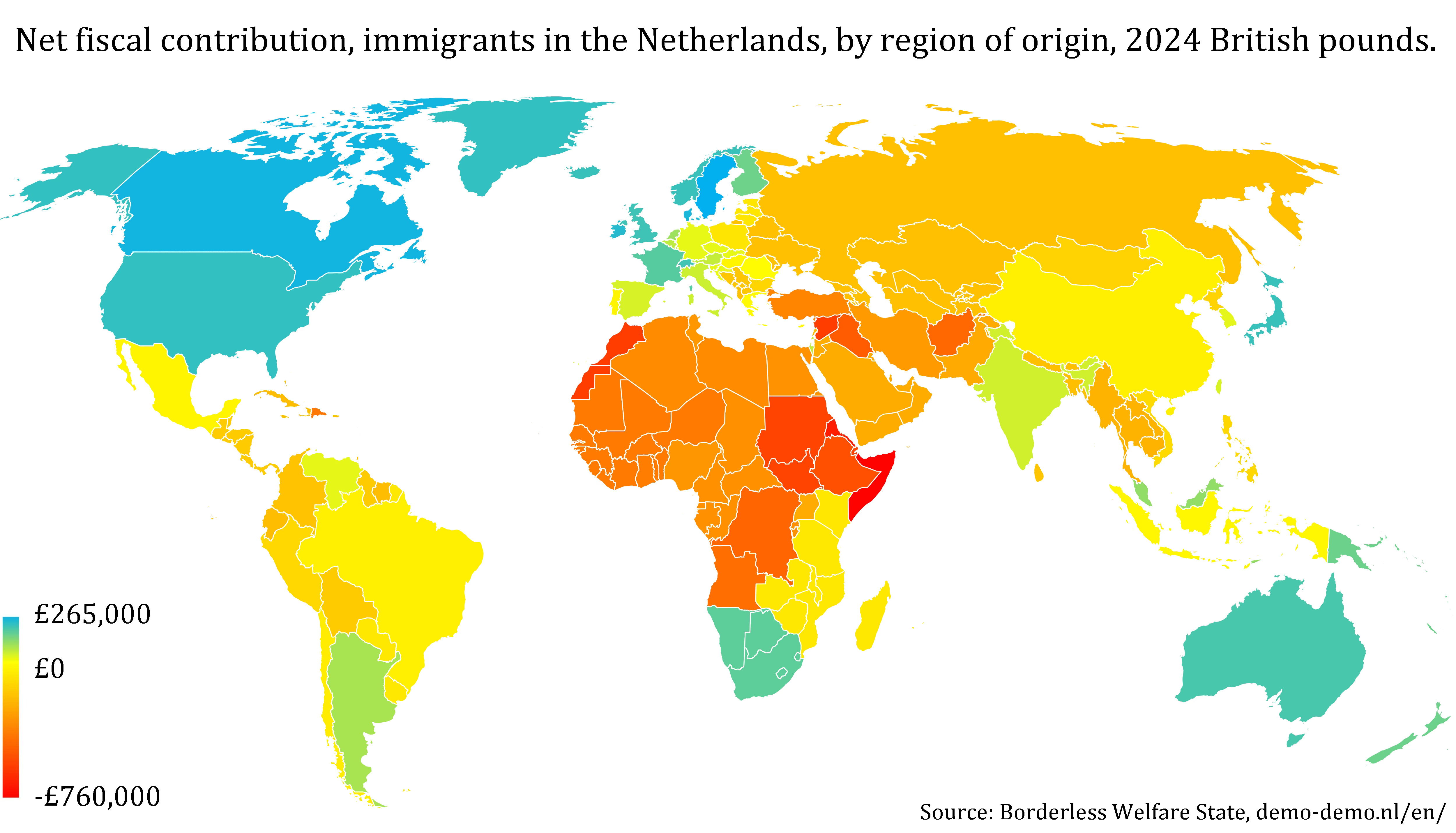 As Jan van der Beek also finds, while poorly-educated immigrants are a net fiscal cost on Western economies, so too are migrants who are moving into the West to join family members, study, or seek asylum (as many in the UK are doing). In the UK, for example, while people often assume that international students are affluent PhD students from Chile the reality is quite different. More than 40% of graduate visa holders in the UK earn less than £15,000 a year, with many ending up servicing the low-wage, low-skill Deliveroo economy. Only migrants who are moving for work make a net contribution although even then the pattern is mixed. As van der Beek finds, whereas labour migrants from North America, Oceania and Japan bring a net fiscal gain to the economy of some £670,000, asylum migrants from Africa, like many of those arriving in the UK, cost the Dutch a net cost of £685,000 per migrant.