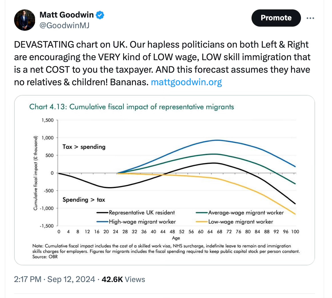 And the OBR find this while suffering from big problems. They make some truly bizarre calculations, like assuming immigrants have no children and dependents and while completely disregarding things like the fiscal cost of immigration on housing, education, and crime —which have been shown to be significant.