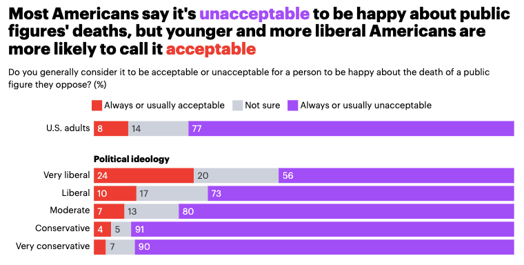 YouGov found that after Charlie Kirk’s murder more than one in five Americans refused to say it was unacceptable for a person to feel happy about the death of a public figure they oppose. And there were big differences beneath the surface.