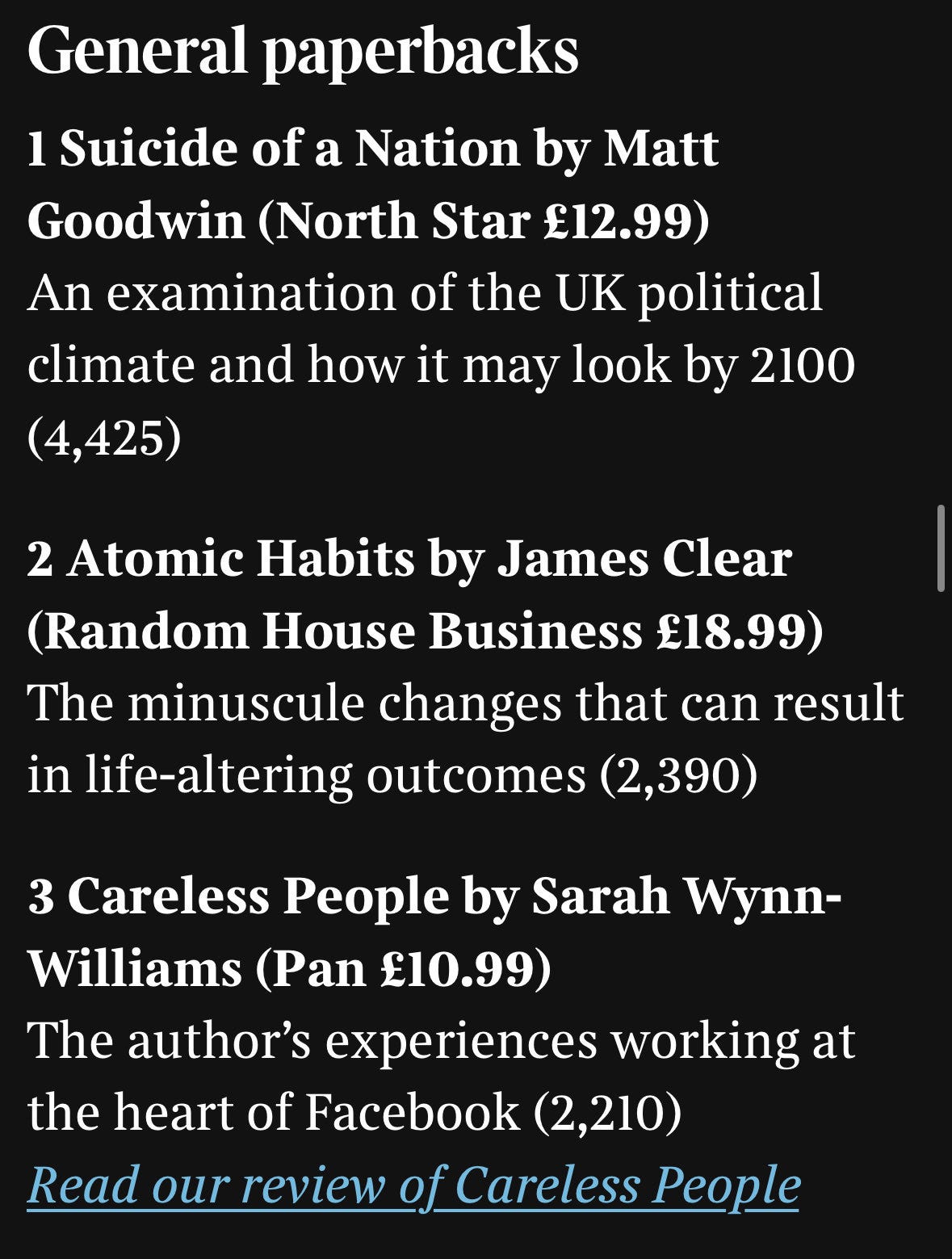 Suicide of a Nation is now the No.1 paperback in Britain on the Sunday Times bestseller list. I can’t quite believe it.