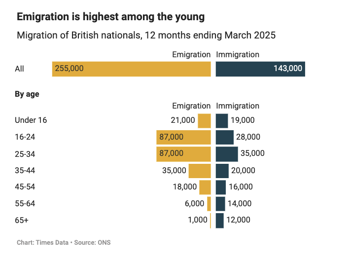 Meanwhile, enormous numbers of people left Britain, which helps to explain why the overall net migration figure is low. Lots of Europeans left, but so too did lots of British people —especially young British people, many aged 16-34-years-old.